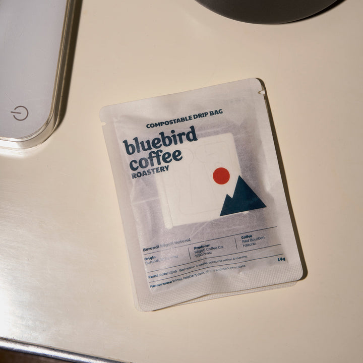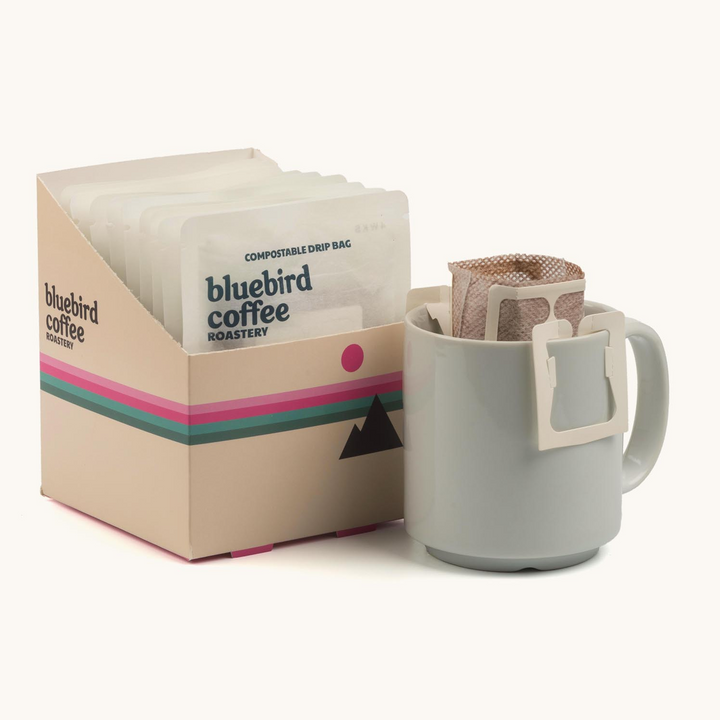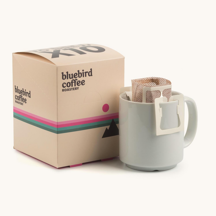 A Box of 10 Compostable Coffee Drip Bags – Single Origin Light Roast – with balanced notes. Enjoy with milk or black.
