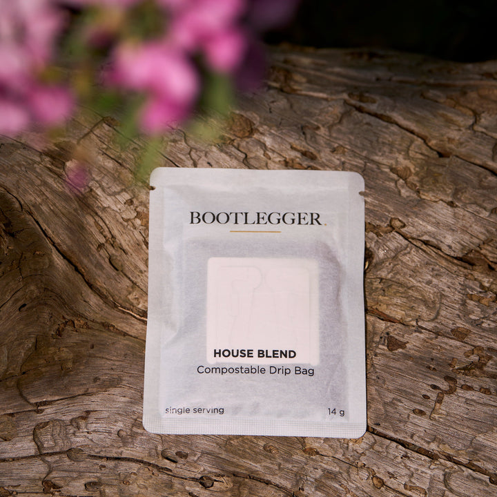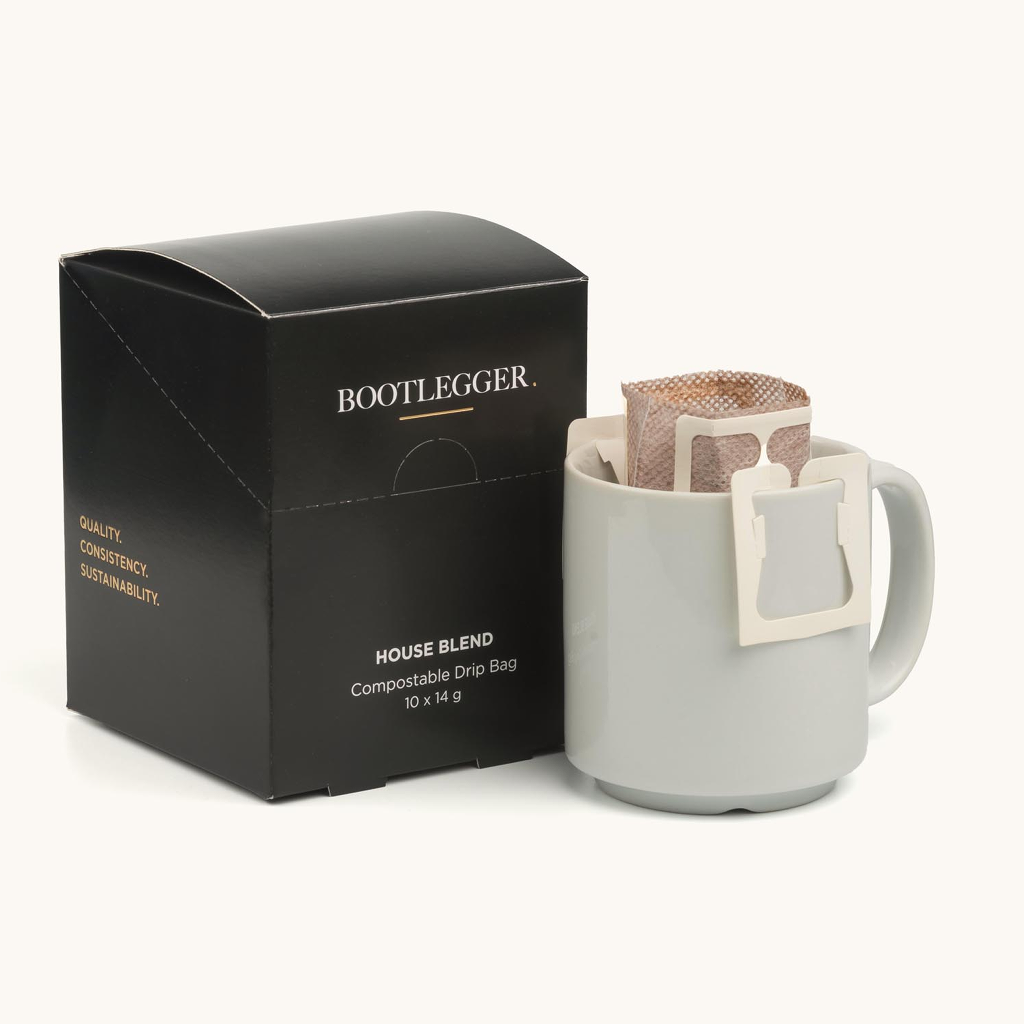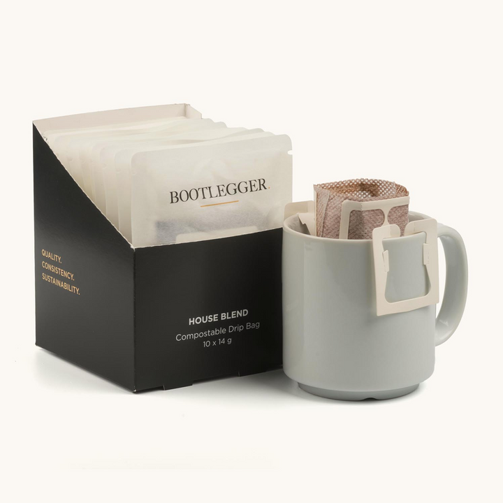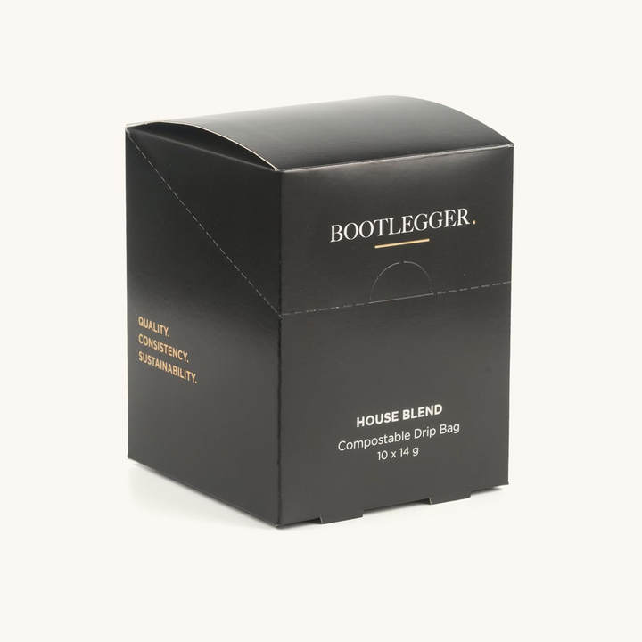 A Box of 10 Compostable Coffee Drip Bags – Medium Roast – with balanced notes. Enjoy with milk or black.