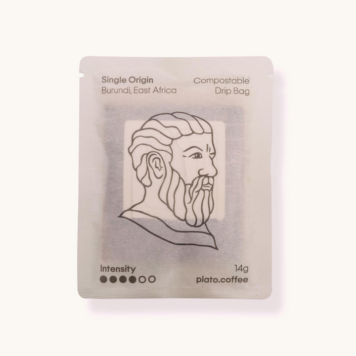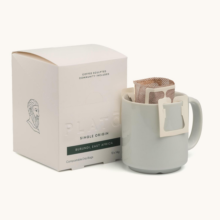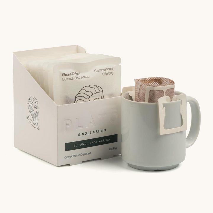 A Box of 10 Compostable Coffee Drip Bags – Single Origin Light Roast – with balanced notes. Enjoy with milk or black.