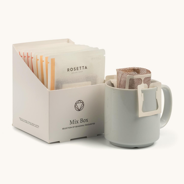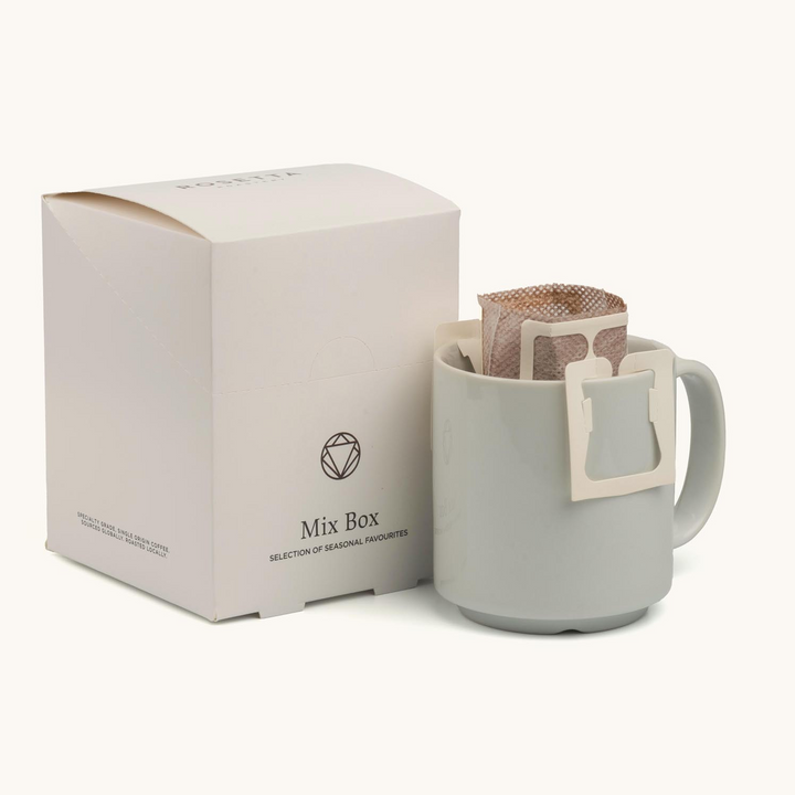 A Mixed Box of 10 Compostable Coffee Drip Bags – including two exceptional single origin light roast coffee's; Kiangoi AA, Kenya and Goro Badessa, Ethiopia. Enjoy black or iced.